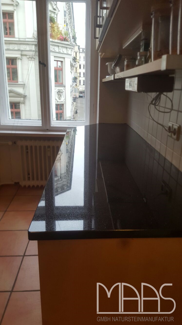 Es wurden zwei Granit Arbeitsplatten aus dem Material Star Galaxy in 3,0 cm Stärke mit den Maßen 203,5 x 62,5 cm und 175,6 x 93,5 cm angefertigt, geliefert und montiert.