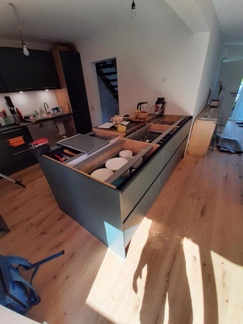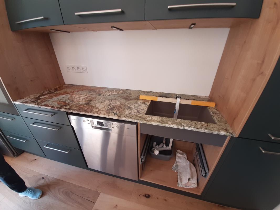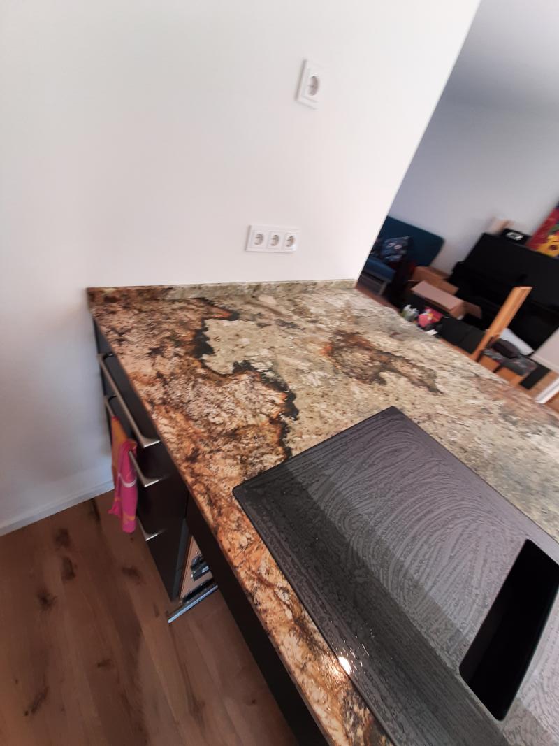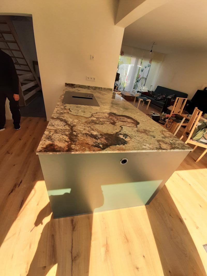 Die Granitplatten sowie der Sockel wurden fachmännisch montiert. Die Kombination aus hochwertigem Material, präziser Verarbeitung und professioneller Montage schafft eine langlebige und stilvolle Basis für den Küchenbereich.