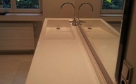 Die Lieferung und Montage bestand aus einem Silestone Blanco Zeus Extreme Waschtisch mit polierter Oberfläche und 1,2 cm Plattenstärke. Der Waschtisch wurde aus einer Platte mit den Maßen 207,70 x 50,30 cm mit intergriertem Wascbecken, zwei Wangen 170,0 x 40,0 cm und einem Gehrungsschnitt hergestellt.