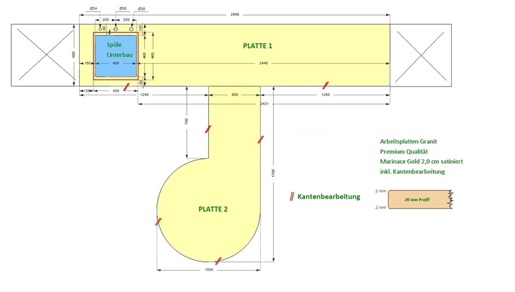 Die Anlage besteht aus zwei Hauptplatten. Die erste Granit Arbeitsplatte ist länglich mit einem präzise eingebrachten Unterbauausschnitt für eine Spüle mit Maßen von 40,00 x 40,00 cm. Rund um die Spüle sind zusätzlich vier Armaturen- und Zubehörbohrungen vorgesehen, exakt positioniert in gleichmäßigen Abständen. Diese Hauptplatte hat eine Gesamtlänge von 299,60 cm und integriert einen seitlichen Versprung von 70,00 cm Tiefe, der zur Verbindung mit der zweiten Plattenform dient.
