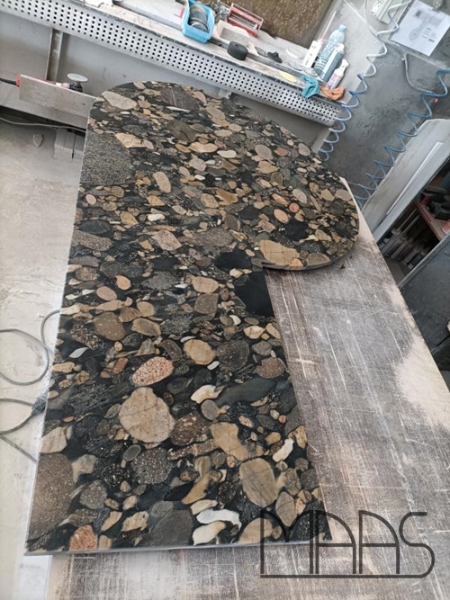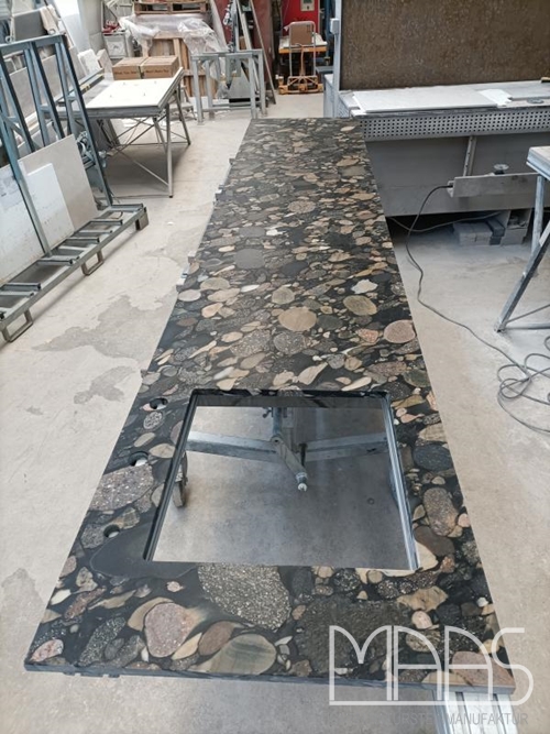 Die zweite Granitplatte bildet eine gerundete Erweiterung mit einer markanten kreisförmigen Ausarbeitung von 100,00 cm Durchmesser und einer Gesamtlänge von 170,00 cm, wodurch sie als funktionale und gestalterisch auffällige Tisch- oder Thekenlösung dient. Alle sichtbaren Kanten wurden mit umlaufender 2 mm Fase bearbeitet, um sowohl optisch als auch haptisch einen hochwertigen Abschluss zu gewährleisten. Die Lieferung wurde exakt gemäß den Plänen vorbereitet und auf Maß gefertigt, passend zur individuellen Raumsituation in Rapperswil-Jona