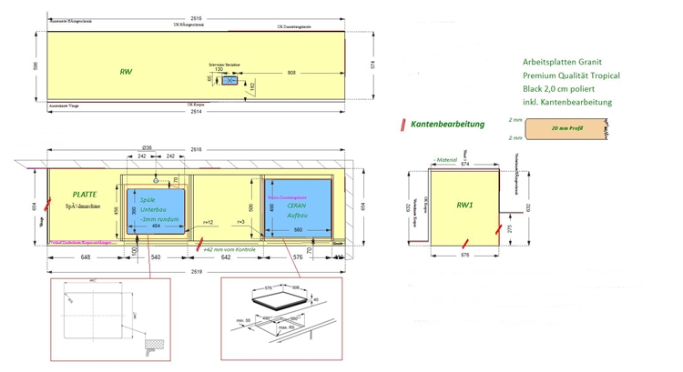 Die Arbeitsfläche besteht aus einer durchgehenden Hauptplatte mit einer Gesamtlänge von 251,60 cm und einer Tiefe von 63,40 cm. In dieser sind präzise Ausschnitte integriert: ein Unterbau-Ausschnitt für eine Spüle mit einem Innenmaß von 48,40 x 38,00 cm, umlaufend um 3 mm untergesetzt, sowie ein Aufbauausschnitt für ein Ceranfeld mit Maßen 56,00 x 49,00 cm. Die Ausschnitte sind passgenau auf die Geräte abgestimmt, mit definierten Radien und genauen Positionierungen, etwa 4,2 cm Abstand vom Plattenrand zum Bedienteil des Kochfelds.