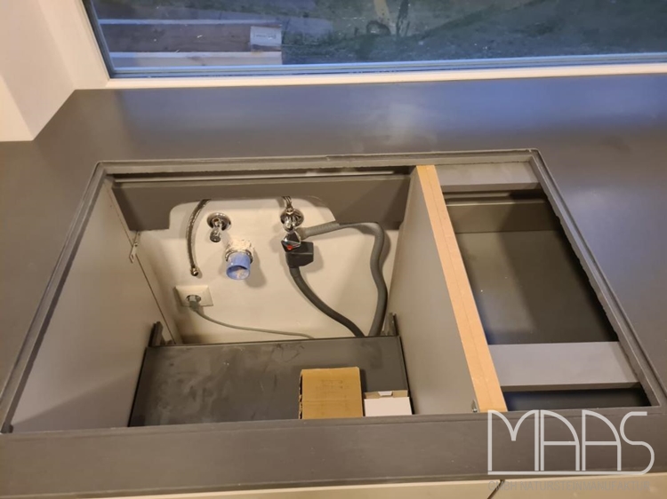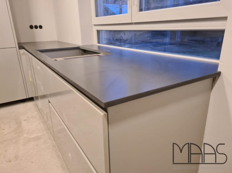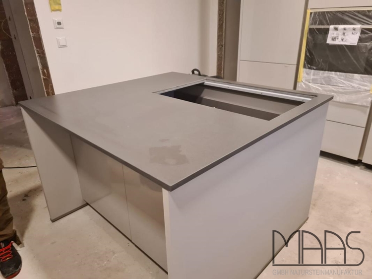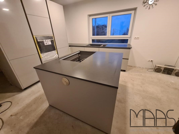 Die Arbeitsflächen bestehen aus Silestone im Farbton Marengo, in 2,0 cm Stärke mit matter Suede-Oberfläche. Die Küchenzeile entlang der Wand ist 292,50 x 84,90 cm groß und verfügt über einen flächenbündigen Ausschnitt für die Spüle, der exakt unterhalb des Fensters positioniert ist. Gegenüber befindet sich eine freistehende Kücheninsel mit einer Arbeitsplatte in den Maßen 120,60 x 127,90 cm. Auch hier ist ein flächenbündiger Ausschnitt für das Ceranfeld integriert. Die Kombination aus dunkler Arbeitsfläche und hellen Möbelfronten erzeugt einen edlen Kontrast und verleiht der Küche eine moderne, hochwertige Ausstrahlung.