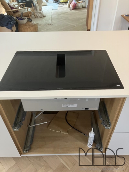 Die 2,0 cm starke Arbeitsplatte bringt nicht nur Stabilität, sondern auch eine hochwertige Anmutung in die Küche. Auf der großzügigen Kücheninsel wurde eine Platte mit den Maßen 245,30 x 102,50 cm verarbeitet, in die ein flächenbündiges Kochfeld integriert wurde – eine Lösung, die klare Linien und eine ruhige Optik erzeugt und sich ideal für offene Wohnräume mit kommunikativem Charakter eignet.