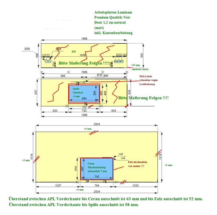 Auf der Küchenzeile mit Hochschränken wurde eine Arbeitsplatte in den Maßen 199,60 x 63,40 cm montiert. In diese Keramikplatte wurde die Unterbauspüle eingesetzt und ein Loch für die Mischbatterie gebohrt. Die Rückwand folgt den Maserungen der Arbeitsplatte und hat die Maße 199,60 x 56,50 cm. In die Laminam Rückwand wurden fünf Steckdosenbohrungen eingearbeitet.